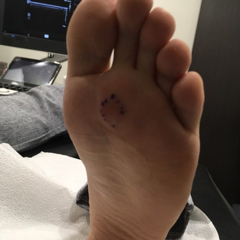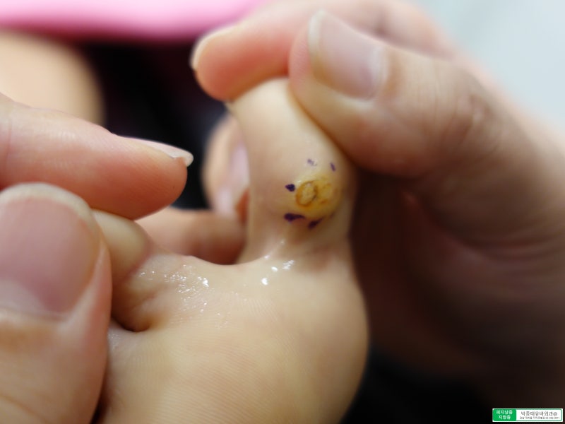 병변은 엄지발가락에 위치하였고 굳은살의 내측에 표피낭종이 보였다.