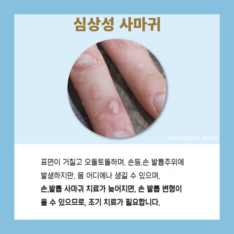 부산 사마귀 제거 환자들이 대표적인 사례였습니다. 시간이 지날수록 악화되는 경향이 있고, 잠시 좋아지는 듯해도 다시 나타나기 때문에 원인을 빨리 찾아내서 영향을 받은 부위를 제거해야 했습니다. 타이밍을 놓치면 발, 손 등 신체 여러 부위에 발진이 생길 수 있으며, 이러한 발진은 고통스러울 수 있습니다. 일부 사람들은 이 피부 질환 때문에 삶의 질이 떨어졌다고 불평하기도 했습니다. 부산 사마귀 제거는 인간 유두종 바이러스에 의해 발생하는 피부 질환입니다. 신체에 잠복해 있던 바이러스가 면역 체계가 약해지면서 활동을 시작하면 다양한 형태로 피부 표면에 나타날 수 있습니다. 이는 환자뿐만 아니라 주변 사람들에게도 전염될 수 있는 문제이므로 신속히 대응하고 가족, 친구에게 전파되지 않도록 주의해야 했습니다.