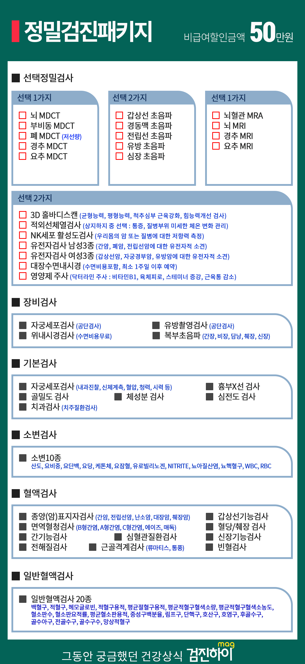 국민건강검진을 받을 때 국민건강보험공단에서 지원하는 항목 외에 본인이 확인하고 싶은 항목이 있으면 추가로 검진을 받을 수 있습니다.꼼꼼한 건강관리를 원하신다면 종합건강검진을 진행하셔야 합니다