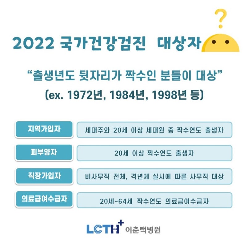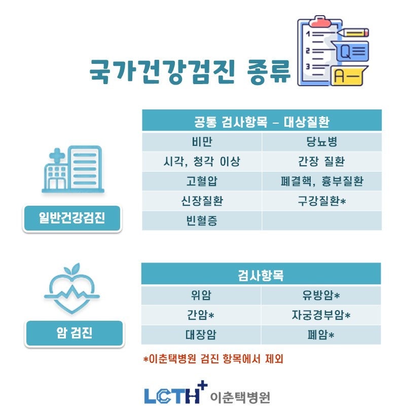 국가고시에서 2년마다 지원되는 종합검진은 신체계측, 시력, 청력, 고혈압, 빈혈, 당뇨, 간질환, 신장질환, 결핵 등 흉부질환 및 구강검진이다. 그 외에도 성별, 연령별 특정 질환에 대한 선별검사가 지원되는지 확인하는 것이 좋습니다. 여기에는 다양한 암 검진, 골다공증, 우울증 및 B형 간염 검사가 포함됩니다.국민건강검진 암검진